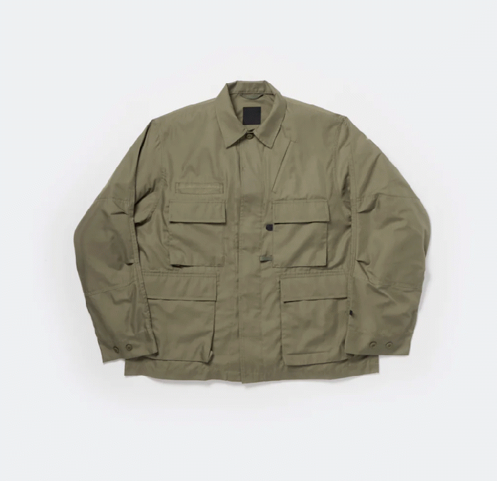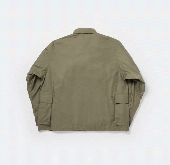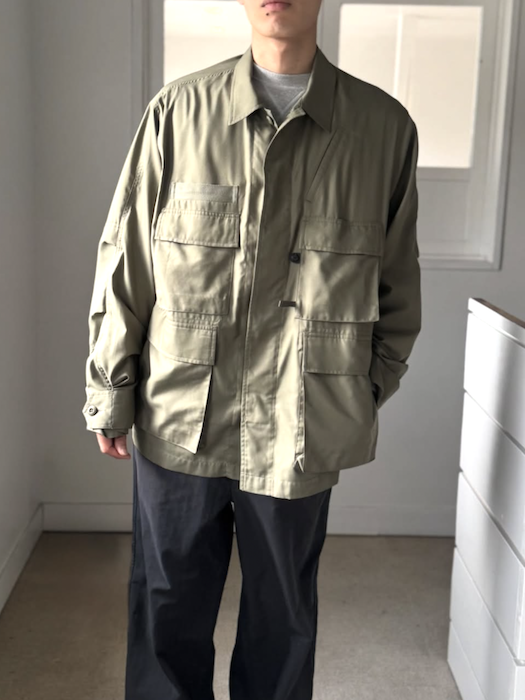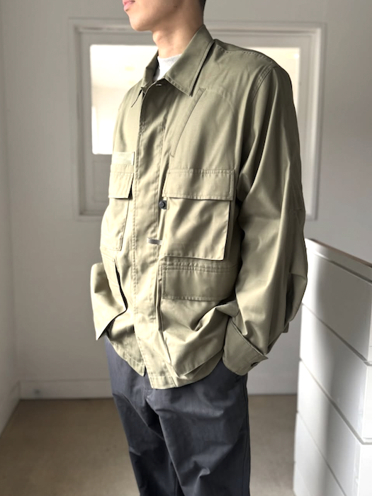 シャツ生地を使用し一枚仕立てでライトウェイトにデザインしたミリタリーフィールドシャツジャケット。サイドに跨るフロントポケットは、ハンティングのポケットワークよりインスピレーションを受けデザイン。軽量ながらも胸ポケットやジッパーポケットなど種類様々なポケットワークを施した。ミリタリーウエアの特徴である袖のアクションプリーツを加え、フィッシングの際キャスティングしやすいディテールを追加。