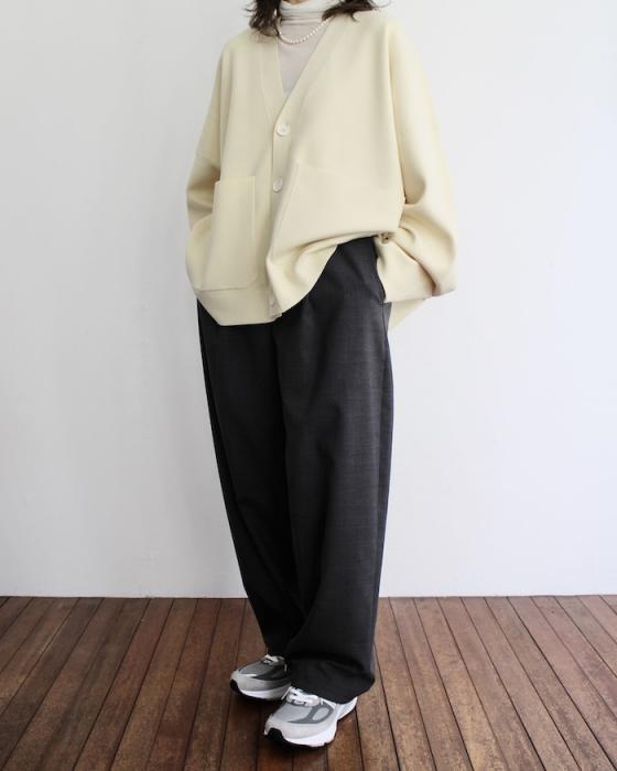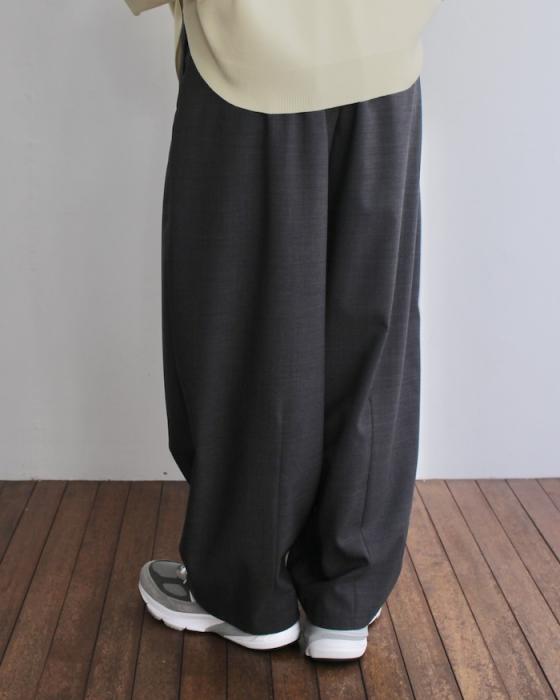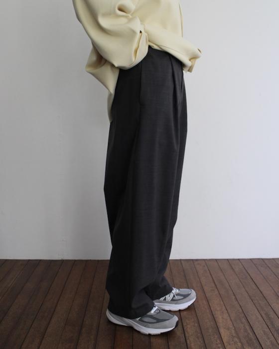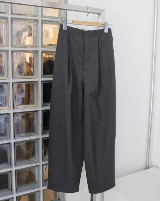 フロントの深めタックと裾のダーツで立体的なシルエットをえがいたパンツです。